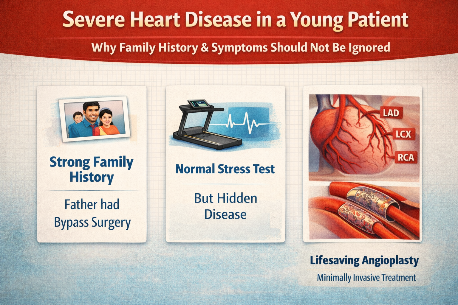 This case of a 36-year-old male business professional demonstrates several important lessons in modern cardiology. First, typical anginal symptoms should never be ignored, even if initial non-invasive testing appears reassuring. Second, a negative treadmill test does not always exclude severe ischemic heart disease, particularly in the presence of multivessel disease or balanced ischemia. Third, careful clinical assessment and timely coronary angiography can be life-saving in such patients.